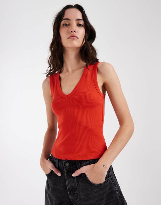 ASOS DESIGN – Geripptes Trägertop in Rot mit V-Ausschnitt