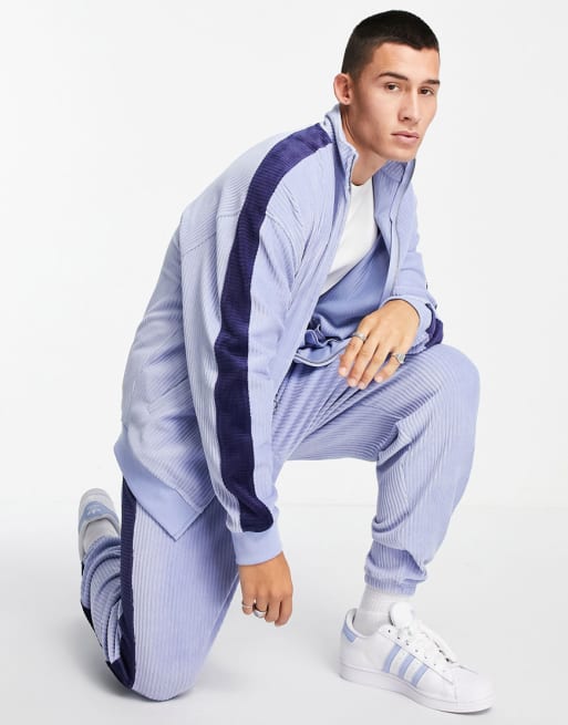 ASOS DESIGN – Geripptes Velours-Set aus Oversize-Trainingsjacke und Jogginghose in Blau mit seitlichem Zierstreifen