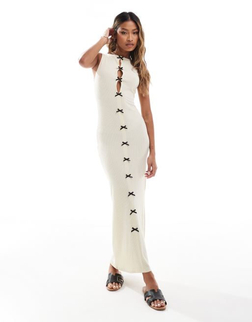 ASOS DESIGN – Geripptes, wadenlanges Kleid in Cremeweiß mit Schleifendetails vorne