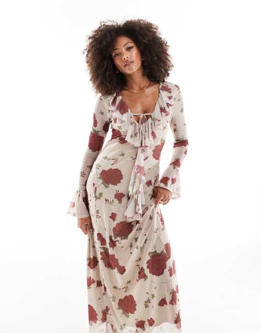ASOS DESIGN – Gerüschtes Maxikleid mit Rosenmuster und Bindedetail vorne