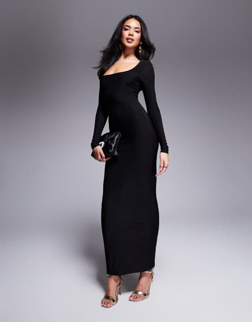 ASOS DESIGN – Geschmeidiges, langärmliges Maxikleid in Schwarz mit eckigem Ausschnitt