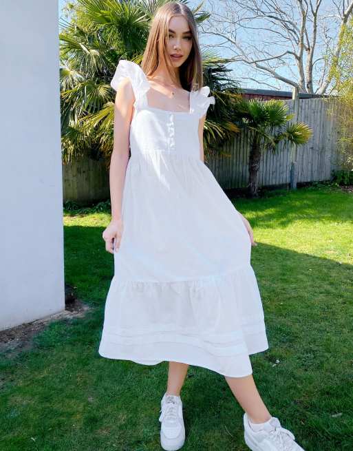 ASOS DESIGN – Gesmoktes Midi-Sommerkleid in Weiß aus Leinen mit Rüschen und eckigem Ausschnitt