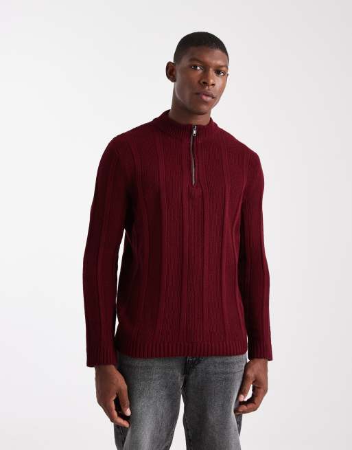 ASOS DESIGN – Gestreifter Strickpullover in Burgunderrot mit Stehkragen und halblangem Reißverschluss