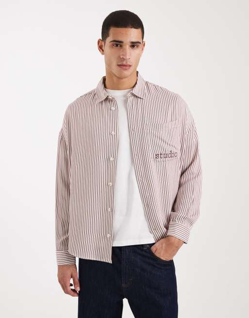 ASOS DESIGN – Gestreiftes Oversize-Hemd in Beige mit Stickerei auf der Brust
