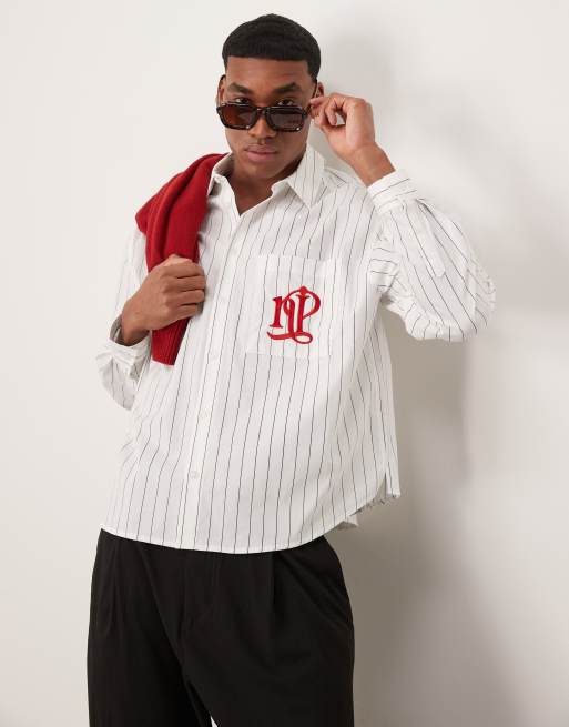 ASOS DESIGN – Gestreiftes Oversize-Hemd mit abgerundetem Saum und Stickerei