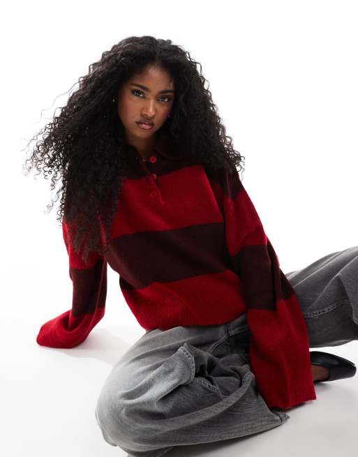 ASOS DESIGN – Gestricktes, gestreiftes Polo-Oberteil in Rot mit Cropped-Schnitt