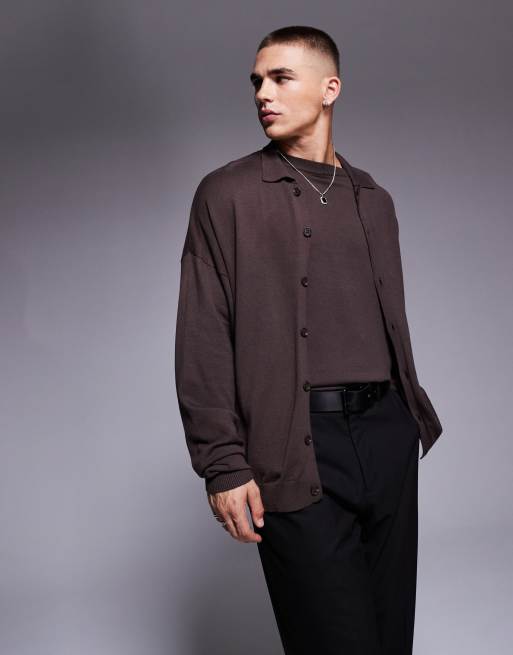 ASOS DESIGN – Gestricktes, langärmliges Polohemd in Braun mit Knopfleiste und lockerem Schnitt, Kombiteil
