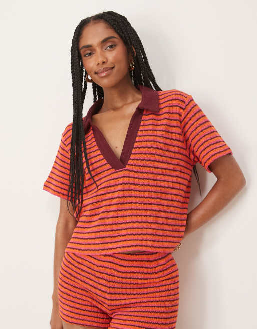 ASOS DESIGN – Gestricktes Oberteil mit Rugby-Kragen in gestreiftem Orange