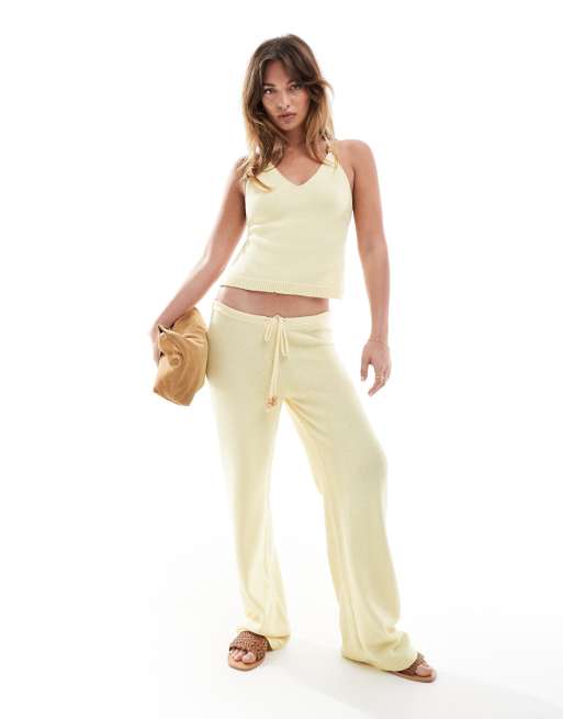 ASOS DESIGN – Gestricktes Set in Buttermilch-Gelb mit Perlendetail, aus Neckholder-Oberteil und Hose