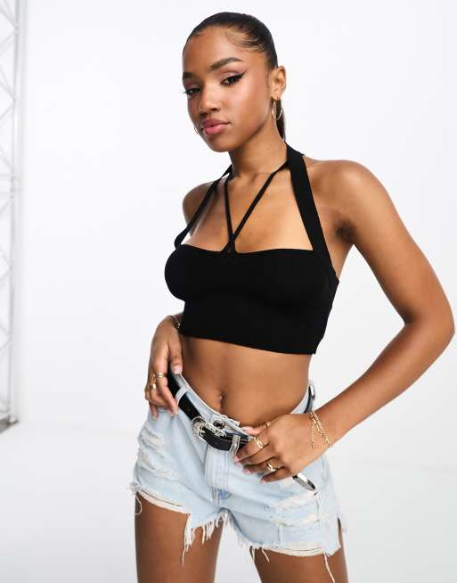 ASOS DESIGN – Gestricktes Trägeroberteil in Schwarz mit Zierausschnitt am Ausschnitt