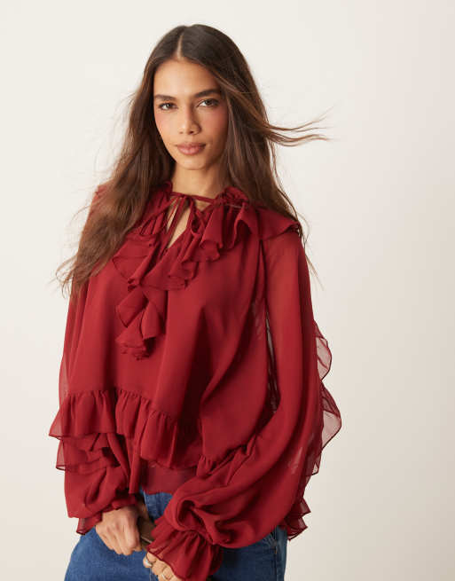 ASOS DESIGN – Gestufte, langärmlige Bluse in Burgunderrot mit Rüschen-Detail