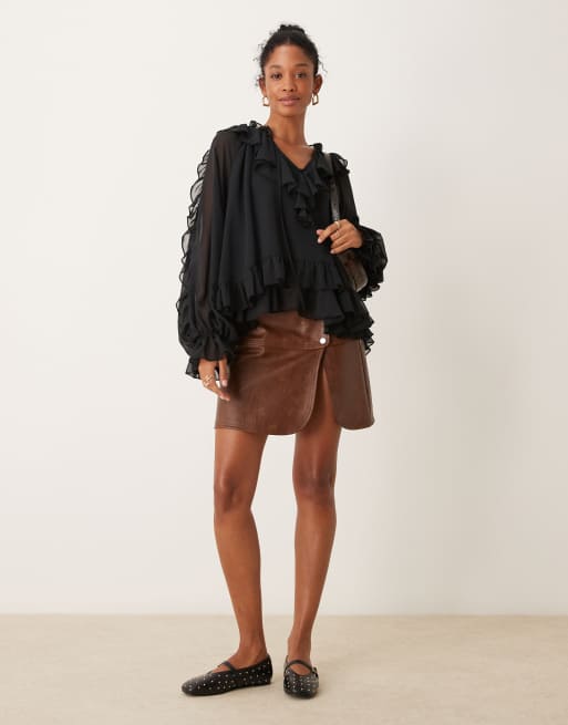 ASOS DESIGN – Gestuftes, langärmliges Oberteil in Schwarz mit Rüschen-Detail