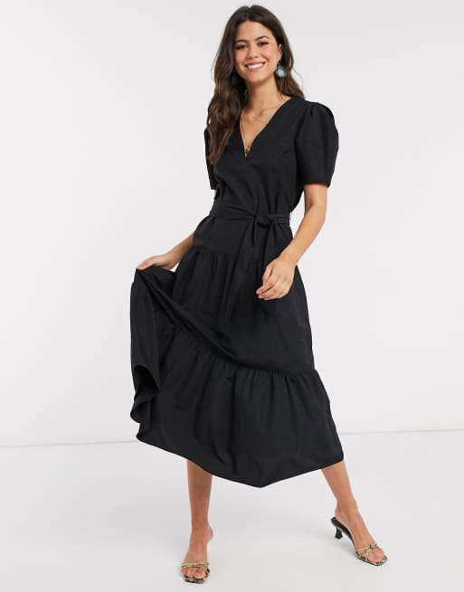 ASOS DESIGN – Gestuftes Midikleid in Schwarz mit V-Ausschnitt und Gürtel