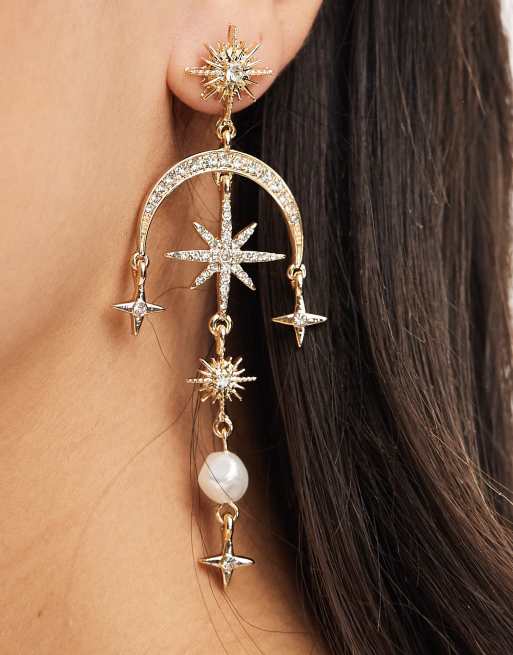 ASOS DESIGN – Goldfarbene Hängeohrringe im Himmelskörperdesign mit Kristallsteinen und Kunstperlen