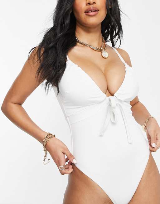 ASOS DESIGN – Größere Brust – Badeanzug in Weiß mit Bindedetail und Raffung