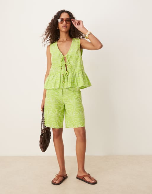 ASOS DESIGN – Großflächig bestickte Bermudashorts in Limettengrün, Kombiteil