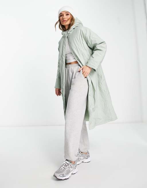 ASOS DESIGN – Gummierter, wattierter Regenmantel aus schwerem Material in Salbeigrün