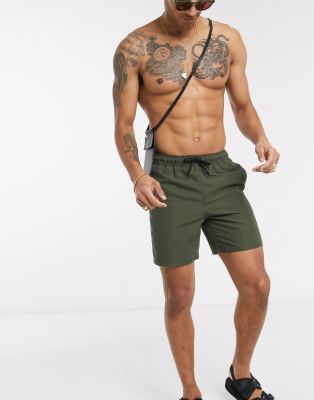 ASOS DESIGN – Halblange Badeshorts in Khaki