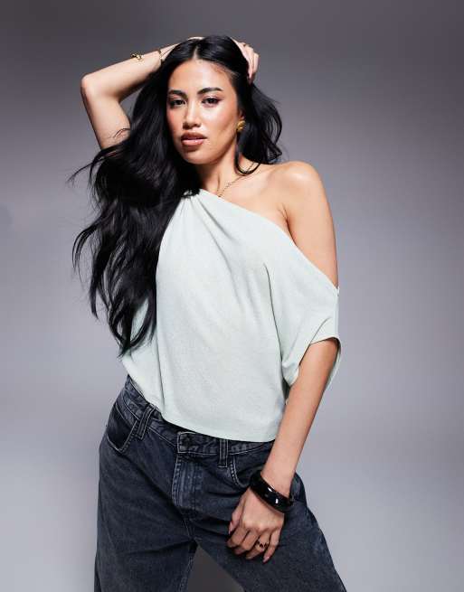 ASOS DESIGN – Halbtransparentes, locker geschnittenes Oberteil in Grün mit One-Shoulder-Träger