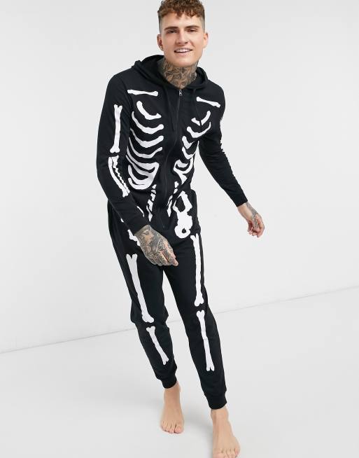 ASOS DESIGN – Halloween – Onesie mit Kapuze und silberfarbenem Skelett-Print