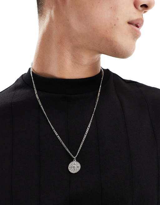 ASOS DESIGN – Halskette aus wasserfestem Edelstahl in polierter Silberoptik mit rundem Kompassanhänger im aztekischen Design
