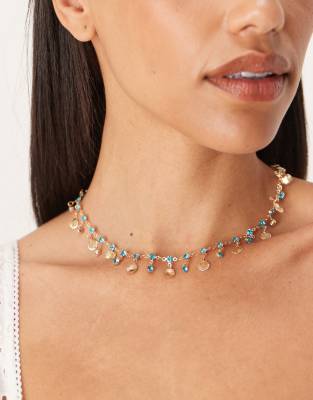 ASOS DESIGN – Halskette mit kleinen goldfarbenen Muscheln und Kunstkristallanhängern in Blau