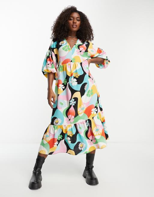ASOS DESIGN – Hänger-Midikleid zum Reinschlüpfen mit Retro-Print in leuchtenden Farben