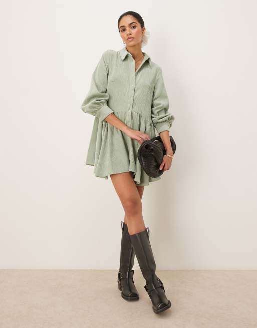 ASOS DESIGN – Hänger-Minikleid aus Cord in Salbeigrün mit Schößchen