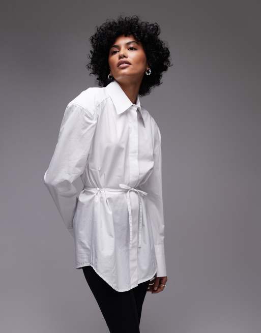 ASOS DESIGN – Hemdbluse in Weiß mit betonter Taille und Schulterpolstern