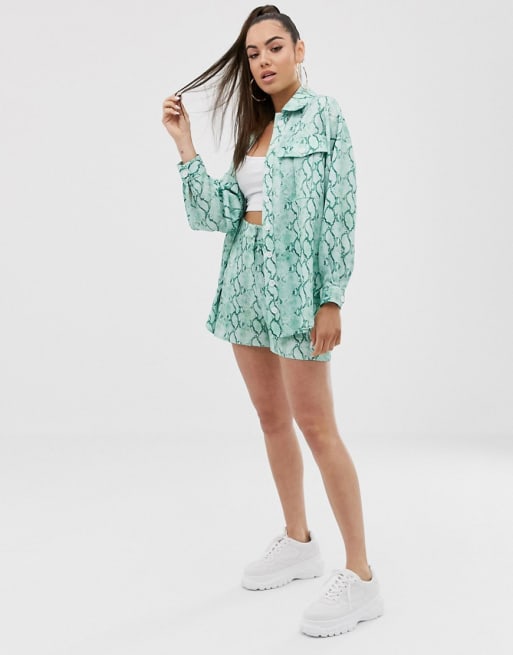 ASOS DESIGN – Hemdjacke und Shorts mit grünem Schlangenmuster im Set