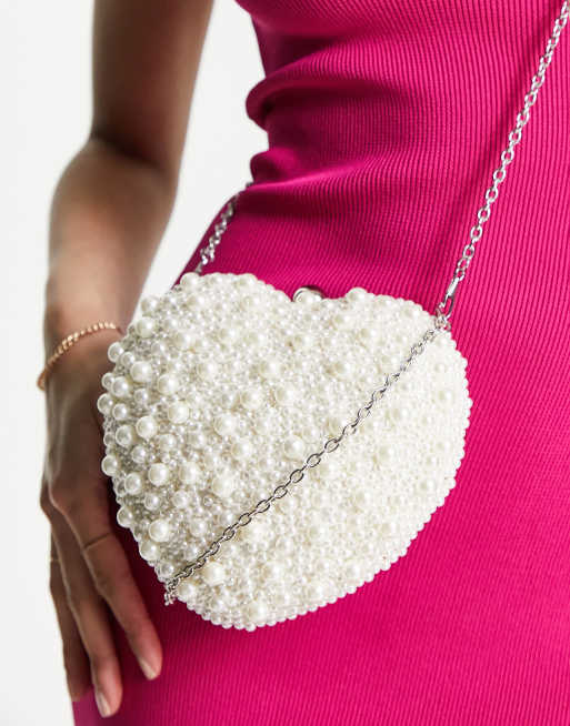 ASOS Design – Herzförmige Clutch aus Satin mit Perlenbesatz in Weiß