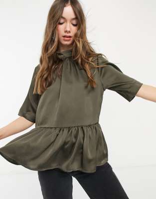 ASOS DESIGN – Hochgeschlossene, kurzärmlige Hängerbluse in Olivgrün mit Schößchen