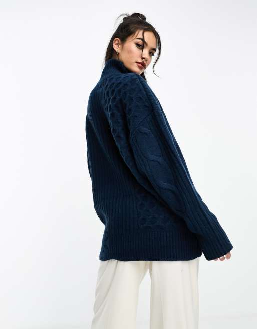 ASOS DESIGN – Hochgeschlossener Longline-Pullover in Marineblau mit Zopfmuster