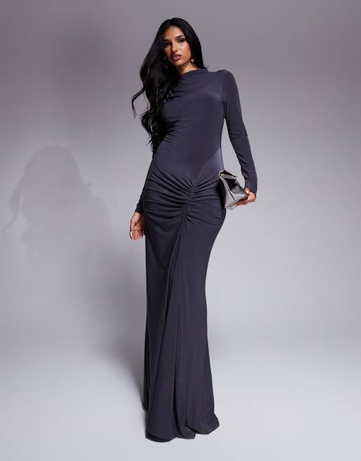 ASOS DESIGN – Hochgeschlossenes, anschmiegsames Maxikleid in Anthrazit mit gerafftem Rock