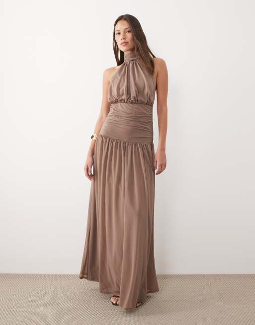 ASOS DESIGN – Hochgeschlossenes Blouson-Maxikleid in Altrosa mit Neckholder und weitem Rock