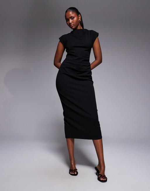 ASOS DESIGN – Hochgeschlossenes, drapiertes Midikleid in Schwarz