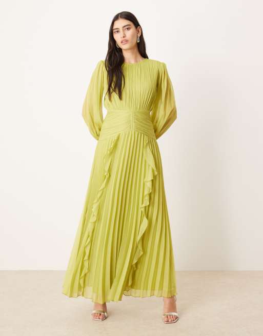 ASOS DESIGN – Hochgeschlossenes, gerafftes Maxikleid in Limettengrün mit Gürteldetail