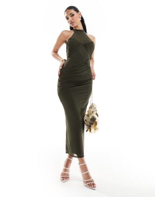 ASOS DESIGN – Hochgeschlossenes, gerafftes Midikleid aus Netzstoff in Khaki mit transparenten Einsätzen und Bindeband hinten