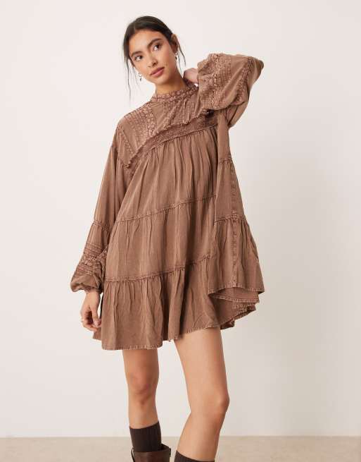 ASOS DESIGN – Hochgeschlossenes Hängerkleid in Braun mit Spitzenbesätzen