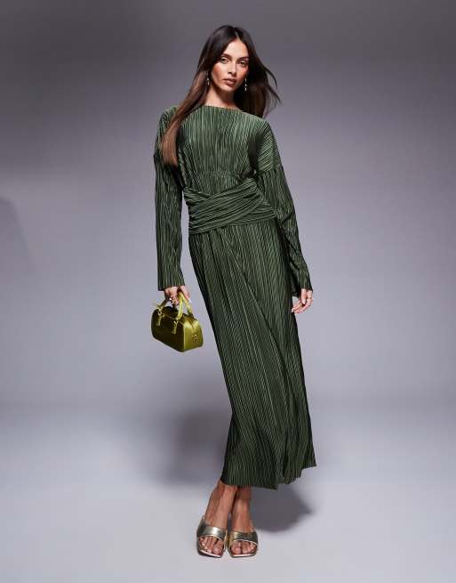 ASOS DESIGN – Hochgeschlossenes, langärmliges Plissee-Maxikleid in Khaki mit gewickelter Taille