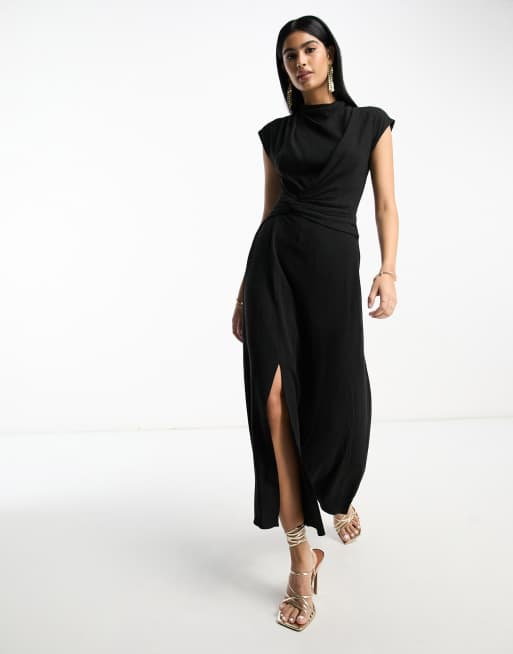 ASOS DESIGN – Hochgeschlossenes Leinen-Midikleid in Schwarz mit verdrehter Vorderseite
