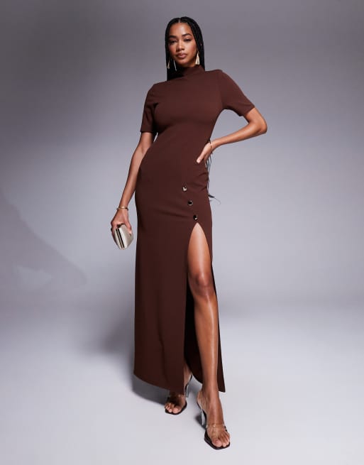 ASOS DESIGN – Hochgeschlossenes Maxi-Bleistiftkleid in Braun mit 3/4-Ärmeln, Schlitz und großen goldfarbenen Knopf-Details