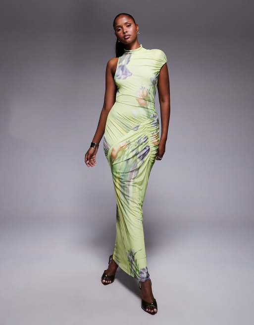 ASOS DESIGN – Hochgeschlossenes Maxikleid aus bedrucktem Netzstoff mit One-Shoulder-Kappärmel und botanischem Blumenprint