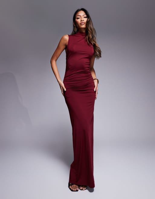 ASOS DESIGN – Hochgeschlossenes Maxikleid in Burgunderrot mit Raffung