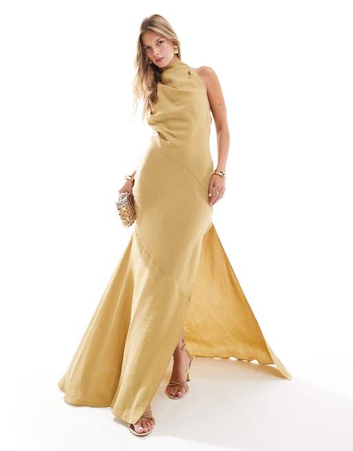 ASOS DESIGN – Hochgeschlossenes Maxikleid in Goldton mit asymmetrischem Schnitt und Schlitz bis zum Oberschenkel