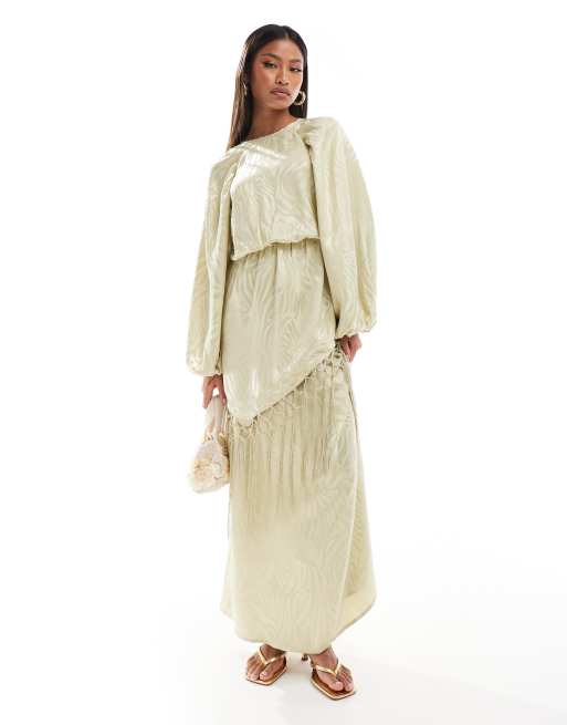 ASOS DESIGN – Hochgeschlossenes Maxikleid in Olivgrün mit Makramee- und Fransendetail
