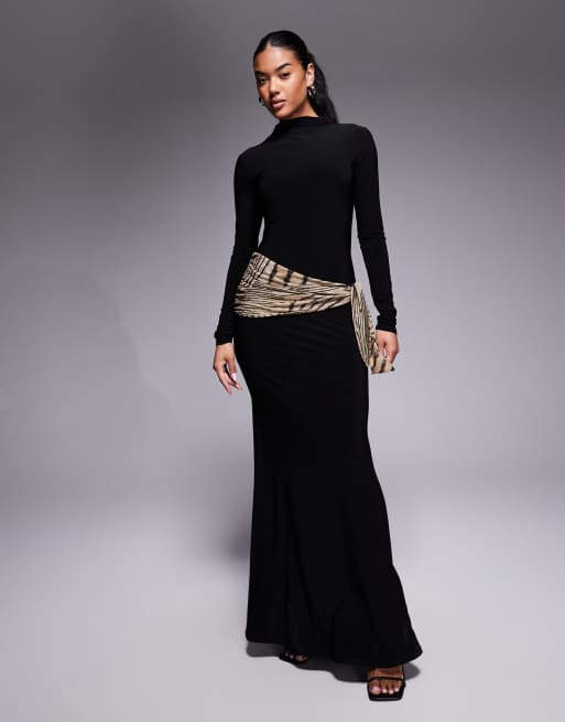 ASOS DESIGN – Hochgeschlossenes Maxikleid in Schwarz mit Rückenausschnitt und bedrucktem Schal-Detail
