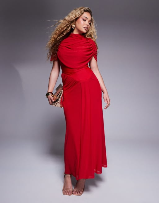 ASOS DESIGN – Hochgeschlossenes Midaxikleid in Rot mit zweifachem Wasserfalldetail und gerafftem Bund