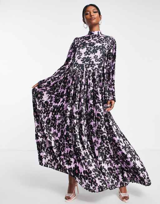 ASOS DESIGN – Hochgeschlossenes, plissiertes Maxikleid in Flieder mit Blumenmuster