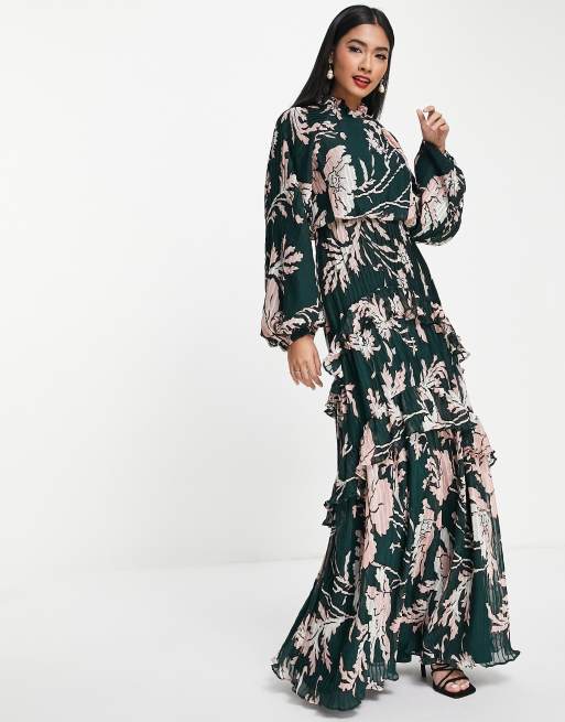 ASOS DESIGN – Hochgeschlossenes, plissiertes Maxikleid mit gestuftem Rock und Blumenprint in Rosa